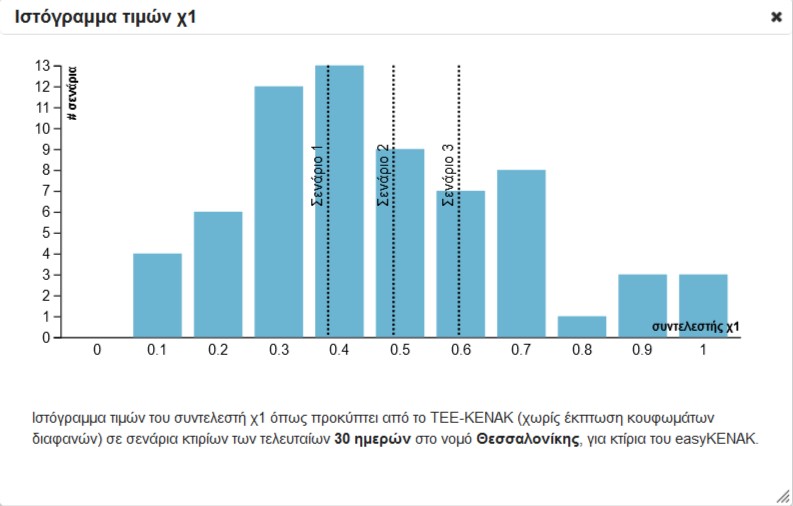 Στο παραπάνω ιστόγραμμα, το “εμβαδό” των κτιρίων αριστερά από τη διακεκομμένη γραμμή “Σενάριο ..”, είναι ουσιαστικά το πλήθος των κτιρίων με καλύτερο χ1 από το Σενάριο.