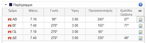 | Προσανατολισμός | Προσανατολισμός μιας επιφάνειας (Β=0°, Α=90°, Ν=180°, Δ=270°), αρκεί να συμπληρώσετε τον προσανατολισμό μιάς πλευράς, οι υπόλοιπες συμπληρώνονται αυτόματα |
