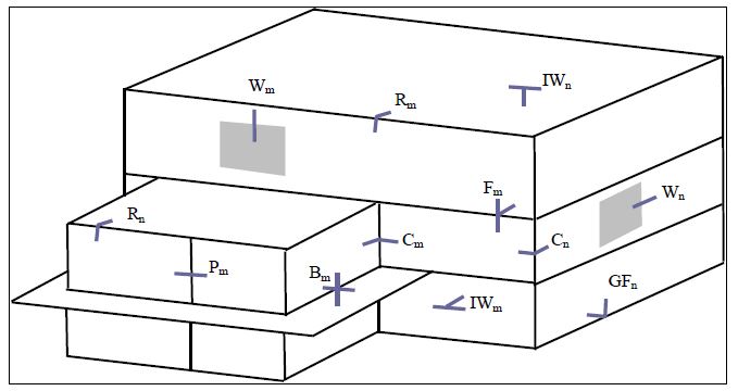 Kατακόρυφες θερμογέφυρες: Οι κατακόρυφες θερμογέφυρες εντοπίζονται στις κατόψεις του κτηρίου. Δεδομένου ότι η κύρια διάστασή τους αναπτύσσεται καθ’ ύψος, το μήκος τους μετράται με βάση τα σχέδια των τομών. Ενδεικτικές θέσεις εμφάνισης κατακόρυφων θερμογεφυρών: